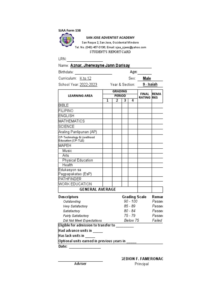 Jhs Form 138 PDF